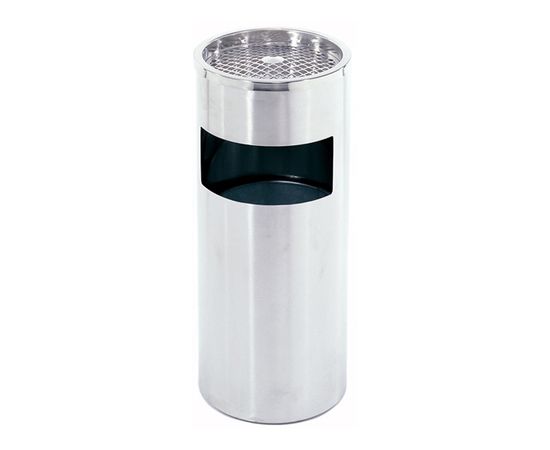 Корпус офисной урны цилиндрической формы D250х610мм, изготовленный из нержавеющей стали толщиной 0,6 мм. Урна имеет боковую загрузку мусора с одной стороны с контейнером D210х275 мм и объемом 9,6л. из оцинкованной стали и ручкой для удобства выемки контейнера из корпуса урны для мусора. В верхней части урны имеется съемная пепельница из нержавеющей стали D240х55мм и объемом 2,1 литра. со съемной хромированной крышкой с квадратными отверстиями размером 10х10мм. Корпус урны, верхняя решетчатая крышка и контейнер пепельницы изготовлены из нержавеющей стали, надежно защищающее офисную урну от воздействия коррозии и на долго сохраняющее ее привлекательный внешний вид. Урна не имеет специального крепления к полу.